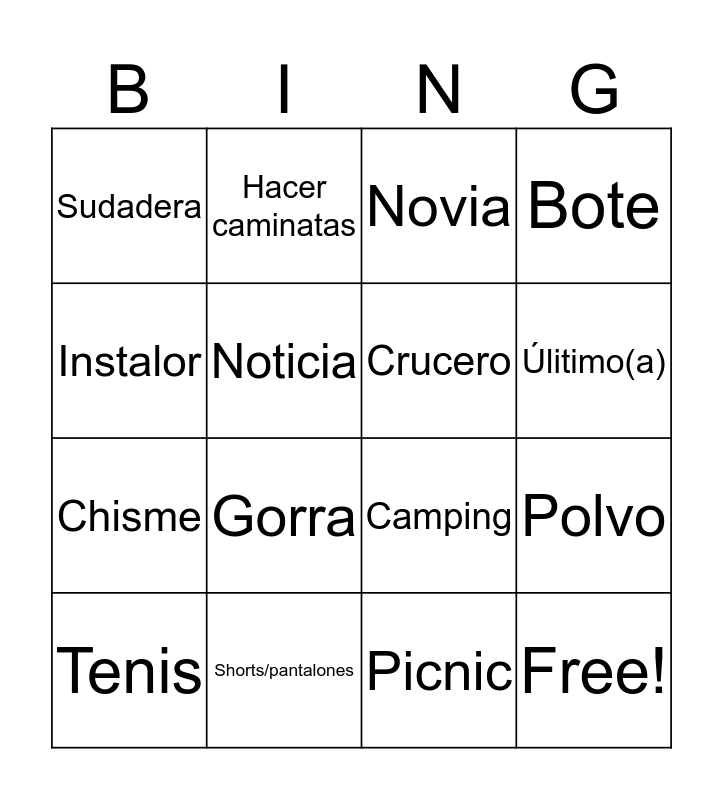 This bingo card has a free space and 24 words: Novio, Caravana, Úlitimo(a), Sin mangas, Instalor, Sudadera, Noticia, Hacer caminatas, Shorts/pantalones, Sandalias, Chisme, Free!, Creer, Solo(a), Crucero, Visitar, Picnic, Novia, Gorra, Polvo, Tenis, Pintar, Bote and Chanclas.