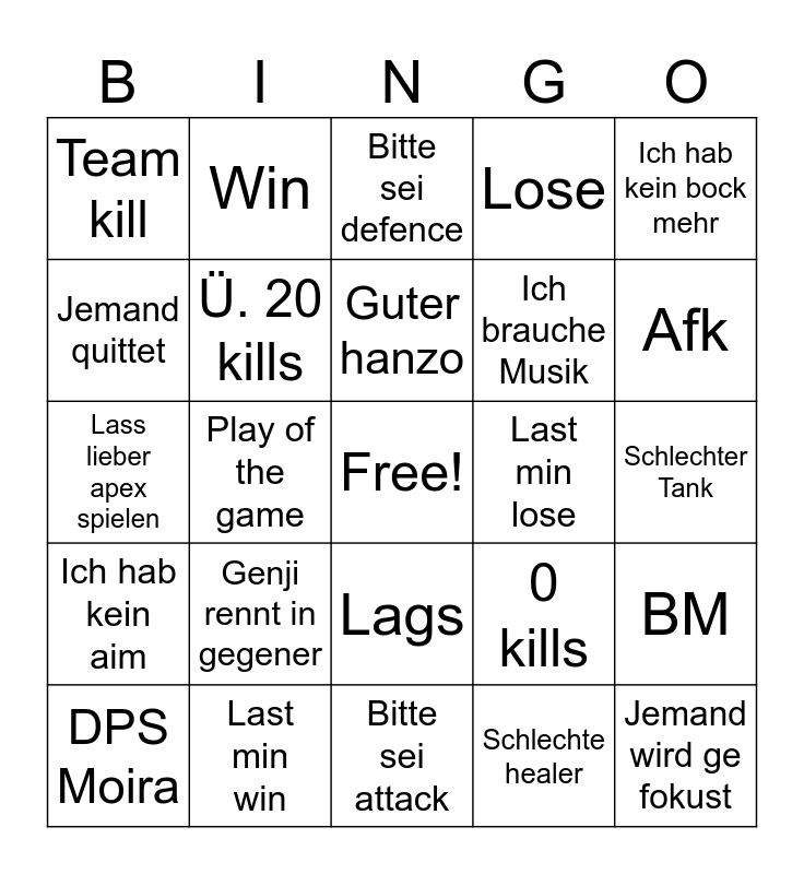 This bingo card has a free space and 24 words: DPS Moira, Genji rennt in gegener, Guter hanzo, Schlechte healer, Ich hab kein bock mehr, Team kill, Win, Bitte sei defence, Last min lose, Schlechter Tank, Lass lieber apex spielen, Ü. 20 kills, 0 kills, BM, Jemand quittet, Last min win, Bitte sei attack, Lose, Afk, Ich hab kein aim, Play of the game, Lags, Ich brauche Musik and Jemand wird ge fokust.