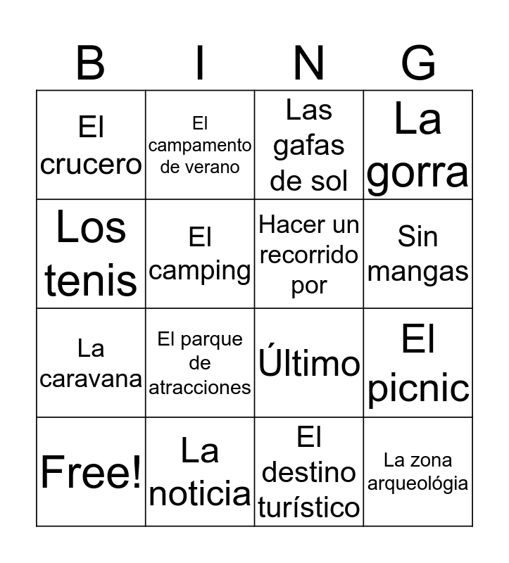 This bingo card has a free space and 15 words: Free!, La zona arqueológia, Las gafas de sol, El crucero, Sin mangas, Los tenis, El parque de atracciones, El destino turístico, El camping, La caravana, El picnic, La gorra, Hacer un recorrido por, El campamento de verano and La noticia.
