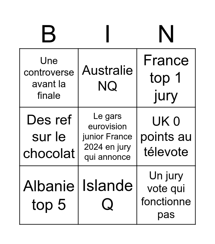 This bingo card has a free space and 8 words: UK 0 points au télevote, France top 1 jury, Australie NQ, Albanie top 5, Une controverse avant la finale, Un jury vote qui fonctionne pas, Des ref sur le chocolat and Islande Q.