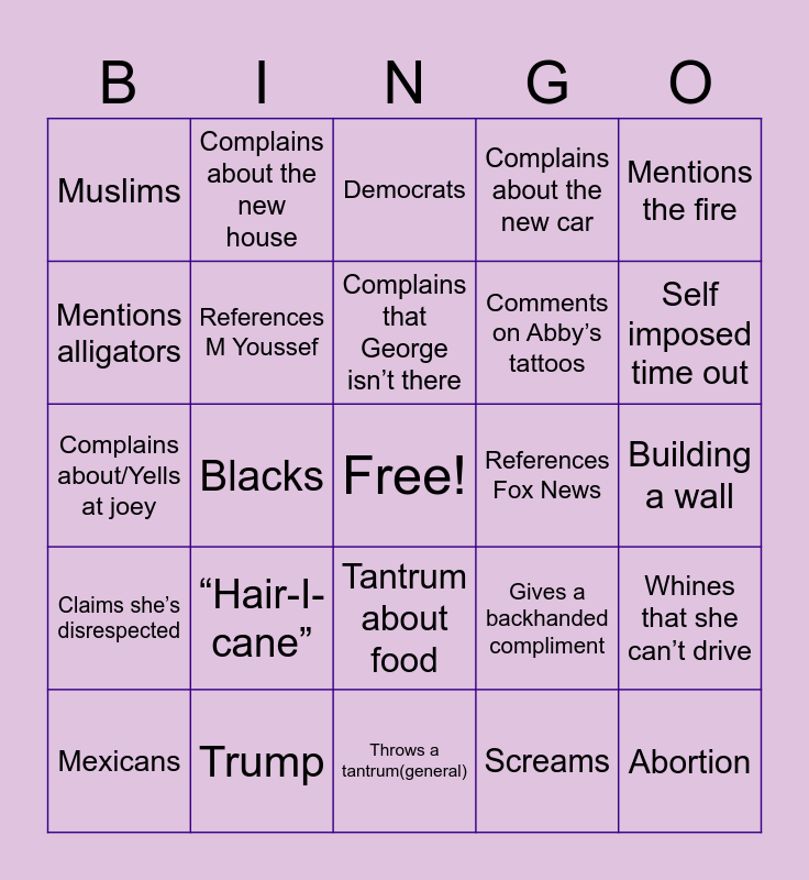 This bingo card has a free space and 29 words: Mexicans, Orientals, Blacks, Indians, Muslims, Democrats, References M Youssef, “Hair-I-cane”, References Fox News, Trump, Building a wall, Abortion, Throws a tantrum(general), Screams, Self imposed time out, Decides she’s nauseous, Tantrum about food, Claims she’s disrespected, Mentions the fire, Complains about/Yells at joey, Gives a backhanded compliment, Calls Kamala Harris a border tzar, Comments on Abby’s tattoos, Mentions alligators, Complains about the new car, Complains about the new house, Whines that she can’t drive, Complains that George isn’t there and Complains about her birthday this year.