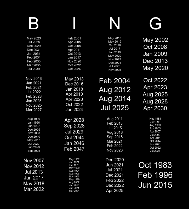 This bingo card has 16 words: May 1962 Jan 1971 Oct 1973 May 1989 Aug 1994 Aug 1996 Nov 1996 May 1999 Aug 2007 Jan 2016 Jan 2021 Mar 2024, Nov 1988 Jul 1993 Aug 1993 Apr 2003 Apr 2007 Jul 2009 Apr 2011 Oct 2014 Jun 2021 Oct 2022 Jul 2025, May 2013 May 2015 Oct 2016 Jul 2017 Jan 2019 May 2020 Nov 2023 Dec 2024 Jul 2025 Nov 2025, May 2023 Jul 2025 Dec 2029 Dec 2031 Jan 2034 Feb 2034 Feb 2035 Mar 2035 Jul 2039, Aug 1990 Jan 1996 Jun 1997 Dec 2005 Nov 2008 Dec 2010 May 2015 Jul 2020 Jun 2023 Sep 2025, Feb 2001 Apr 2005 Oct 2005 Apr 2011 Oct 2013 Jan 2017 Nov 2020 Oct 2022 Oct 2024, Aug 2011 Feb 2013 Jul 2015 Aug 2016 Sep 2018 Mar 2021 Feb 2022 Nov 2023, Dec 2020 Jun 2021 Jul 2021 Dec 2021 Feb 2022 Dec 2022 Apr 2025, Nov 2018 Jan 2021 Feb 2021 Jul 2022 Feb 2023 Jan 2025 Nov 2025 Mar 2027, May 2013 Dec 2016 Jan 2018 Apr 2019 Apr 2020 Oct 2022 Jan 2024, Nov 2007 Nov 2012 Jul 2013 Jun 2017 May 2018 Mar 2022, May 2002 Oct 2008 Jan 2009 Dec 2013 May 2020, Apr 2028 Sep 2028 Jul 2029 Oct 2044 Jan 2046 Feb 2047, Oct 2022 Apr 2023 Aug 2025 Aug 2028 Apr 2030, Feb 2004 Aug 2012 Aug 2014 Jul 2025 and Oct 1983 Feb 1996 Jun 2015.