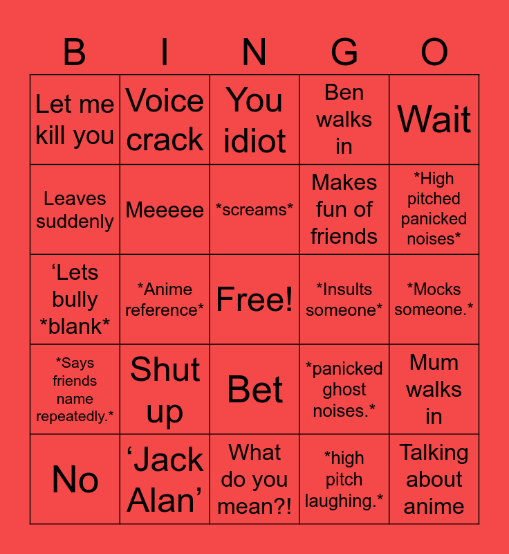 This bingo card has a free space and 24 words: No, Shut up, *screams*, *high pitch laughing.*, Wait, Let me kill you, Voice crack, You idiot, *Insults someone*, *Mocks someone.*, ‘Lets bully *blank*, Meeeee, *panicked ghost noises.*, Mum walks in, Leaves suddenly, ‘Jack Alan’, What do you mean?!, Ben walks in, *High pitched panicked noises*, *Says friends name repeatedly.*, *Anime reference*, Bet, Makes fun of friends and Talking about anime.