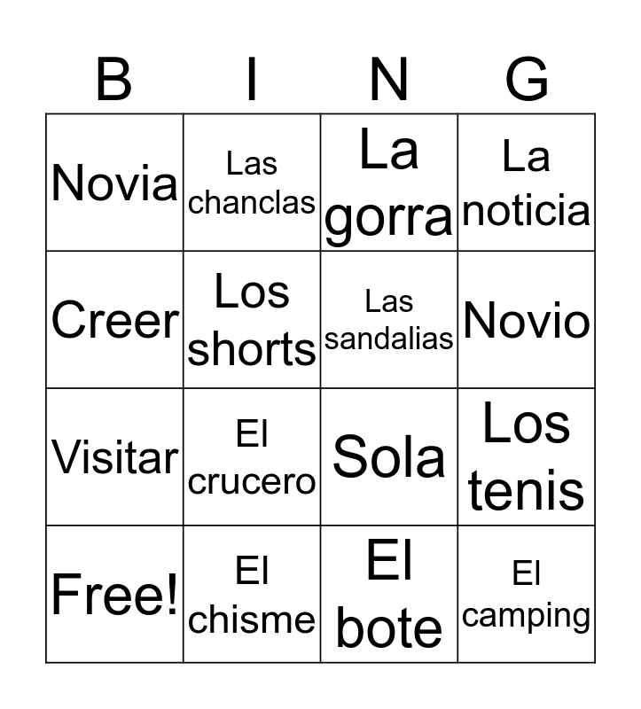 This bingo card has a free space and 15 words: Free!, El camping, La gorra, Novia, Novio, Creer, El crucero, El bote, Los shorts, Visitar, Los tenis, La noticia, Las sandalias, Las chanclas and El chisme.