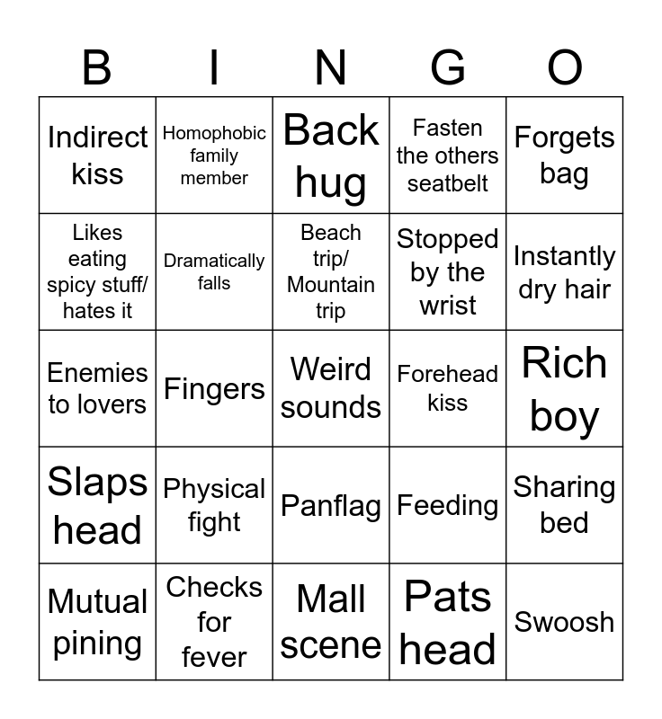 This bingo card has 59 words: Invites themselves over, Checks for fever, Stargazing, Slaps head, Pats head, Ikea/Sweden represented, Dramatically falls, Product placement, Stopped by the wrist, Break up, Fasten the others seatbelt, Dragging arm, Likes eating spicy stuff/ hates it, Healing wound, Wipe off body, Indirect kiss, Weird sounds, Forgets bag, Shower scene, Beach trip/ Mountain trip, Forehead kiss, Back hug, Mutual pining, Sharing bed, Taking of shirt >> staring, Garage, Eats at a street food place, Puls out a guitar, Instantly dry hair, Dumb friend(s), Dead parent(s), Leaning on shoulder, Cheek sniff/kiss, ep 11 curse, Homophobic family member, Coming out, Time skip, Fingers, Oishi, Enemies to lovers, Sulking and drinking, Physical fight, Rich boy, Temple, Monk offerings, Splashing/ spilling drink, Helping putting on/taking off helmet, Puts cold drink on cheek/neck, Panflag, Mall scene, Protects the other from rain, Does something on a completely black screen, Cheating, Sitting on swings, Water war, Feeding, Gifts a bracelet, Swoosh and Top besties x bottom besties.