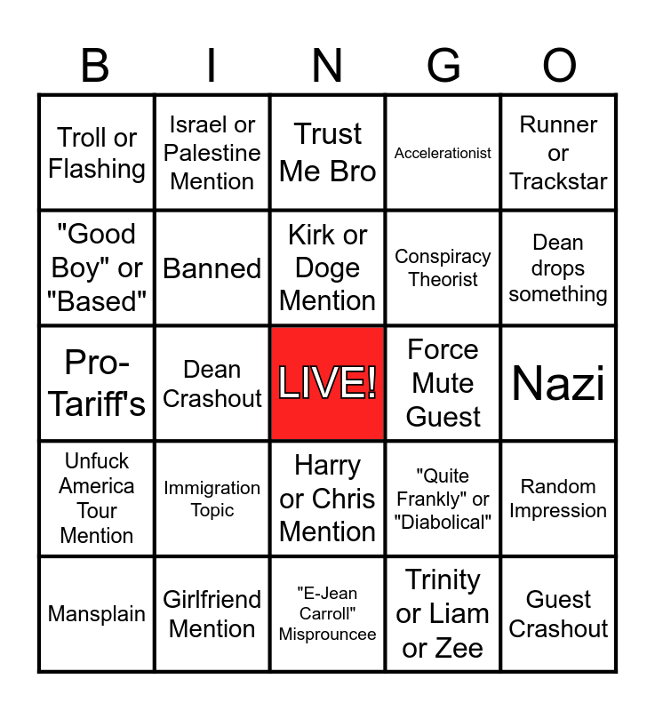 This bingo card has a free space and 24 words: Immigration Topic, Girlfriend Mention, Kirk or Doge Mention, Mansplain, Runner or Trackstar, Troll or Flashing, "Good Boy" or "Based", Israel or Palestine Mention, Force Mute Guest, Harry or Chris Mention, Conspiracy Theorist, Pro-Tariff's, "Quite Frankly" or "Diabolical", Random Impression, Banned, Trinity or Liam or Zee, Nazi, Trust Me Bro, Dean drops something, Dean Crashout, Guest Crashout, Unfuck America Tour Mention, Accelerationist and "E-Jean Carroll" Misprouncee.