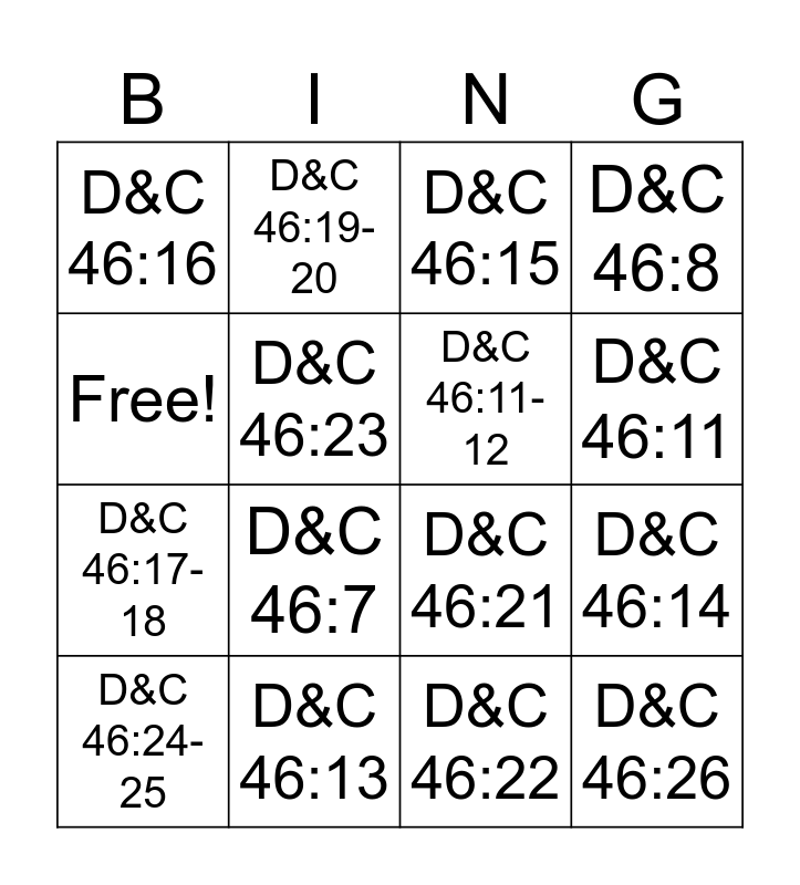 This bingo card has 16 words: D&C 46:13, D&C 46:14, D&C 46:15, D&C 46:16, D&C 46:17-18, D&C 46:19-20, D&C 46:21, D&C 46:22, Free!, D&C 46:23, D&C 46:24-25, D&C 46:8, D&C 46:7, D&C 46:11, D&C 46:11-12 and D&C 46:26.