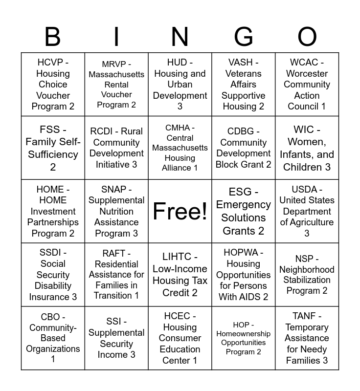 This bingo card has a free space and 25 words: RAFT - Residential Assistance for Families in Transition 1, HCEC - Housing Consumer Education Center 1, CMHA - Central Massachusetts Housing Alliance 1, CBO - Community-Based Organizations 1, WCAC - Worcester Community Action Council 1, HCVP - Housing Choice Voucher Program 2, FSS - Family Self-Sufficiency 2, MRVP - Massachusetts Rental Voucher Program 2, ESG - Emergency Solutions Grants 2, LIHTC - Low-Income Housing Tax Credit 2, CDBG - Community Development Block Grant 2, HOME - HOME Investment Partnerships Program 2, HOPWA - Housing Opportunities for Persons With AIDS 2, NSP - Neighborhood Stabilization Program 2, RCDI - Rural Community Development Initiative 3, EPA - Environmental Protection Agency 3, USDA - United States Department of Agriculture 3, HUD - Housing and Urban Development 3, WIC - Women, Infants, and Children 3, SNAP - Supplemental Nutrition Assistance Program 3, TANF - Temporary Assistance for Needy Families 3, SSI - Supplemental Security Income 3, SSDI - Social Security Disability Insurance 3, VASH - Veterans Affairs Supportive Housing 2 and HOP - Homeownership Opportunities Program 2.