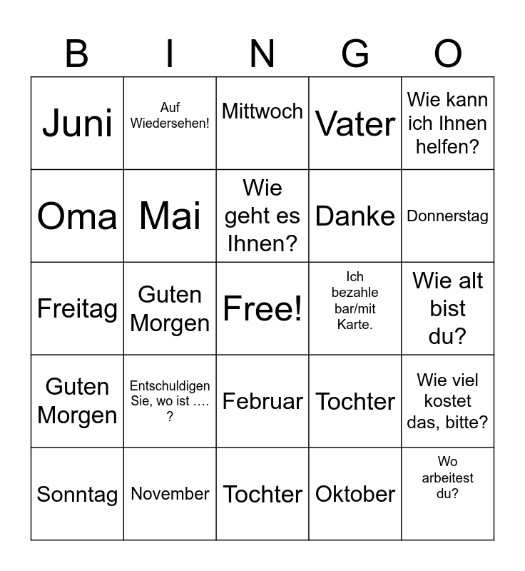 This bingo card has a free space and 24 words: Entschuldigen Sie, wo ist …. ?, November, Wie geht es Ihnen?, Sonntag, Wie kann ich Ihnen helfen?, Juni, Oma, Auf Wiedersehen!, Ich bezahle bar/mit Karte., Februar, Danke, Freitag, Tochter, Wie viel kostet das, bitte?, Mai, Oktober, Wie alt bist du?, Mittwoch, Donnerstag, Guten Morgen, Wo arbeitest du?, Guten Morgen, Vater and Tochter.