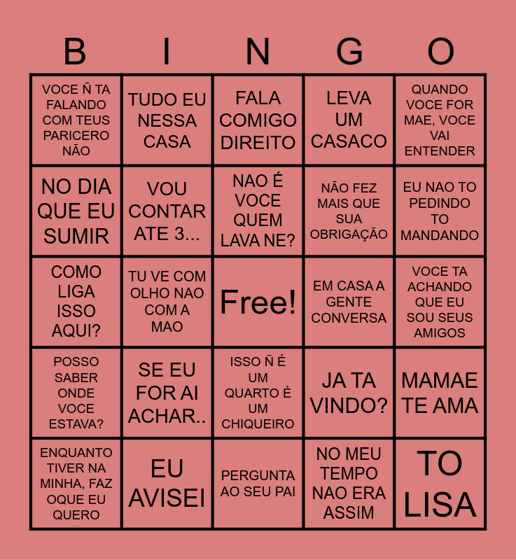 This bingo card has a free space and 24 words: SE EU FOR AI ACHAR.., EU AVISEI, NAO É VOCE QUEM LAVA NE?, ENQUANTO TIVER NA MINHA, FAZ OQUE EU QUERO, QUANDO VOCE FOR MAE, VOCE VAI ENTENDER, VOCE Ñ TA FALANDO COM TEUS PARICERO NÃO, NO DIA QUE EU SUMIR, TUDO EU NESSA CASA, EM CASA A GENTE CONVERSA, ISSO Ñ É UM QUARTO É UM CHIQUEIRO, NÃO FEZ MAIS QUE SUA OBRIGAÇÃO, COMO LIGA ISSO AQUI?, JA TA VINDO?, MAMAE TE AMA, VOU CONTAR ATE 3..., NO MEU TEMPO NAO ERA ASSIM, VOCE TA ACHANDO QUE EU SOU SEUS AMIGOS, FALA COMIGO DIREITO, EU NAO TO PEDINDO TO MANDANDO, TU VE COM OLHO NAO COM A MAO, TO LISA, POSSO SABER ONDE VOCE ESTAVA?, LEVA UM CASACO and PERGUNTA AO SEU PAI.