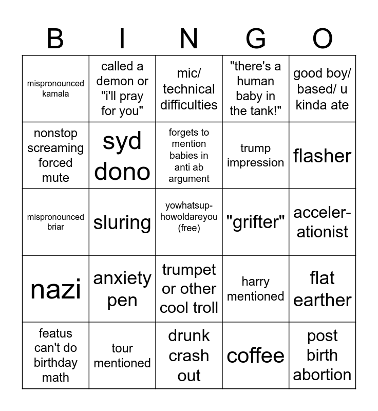 This bingo card has a free space and 24 words: anxiety pen, tour mentioned, forgets to mention babies in anti ab argument, featus can't do birthday math, good boy/ based/ u kinda ate, mispronounced kamala, nonstop screaming forced mute, called a demon or "i'll pray for you", "grifter", trumpet or other cool troll, trump impression, mispronounced briar, harry mentioned, flat earther, syd dono, coffee, acceler-ationist, mic/ technical difficulties, flasher, sluring, post birth abortion, nazi, "there's a human baby in the tank!" and drunk crash out.