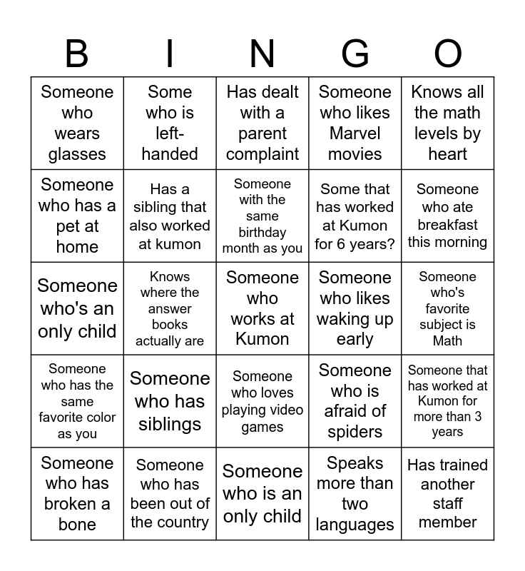 This bingo card has a free space and 24 words: Someone who has siblings, Someone who has been out of the country, Someone with the same birthday month as you, Someone who has broken a bone, Knows all the math levels by heart, Someone who wears glasses, Someone who has a pet at home, Some who is left-handed, Someone who likes waking up early, Someone who loves playing video games, Some that has worked at Kumon for 6 years?, Someone who's an only child, Someone who is afraid of spiders, Someone that has worked at Kumon for more than 3 years, Has a sibling that also worked at kumon, Speaks more than two languages, Someone who's favorite subject is Math, Has dealt with a parent complaint, Someone who ate breakfast this morning, Knows where the answer books actually are, Has trained another staff member, Someone who has the same favorite color as you, Someone who likes Marvel movies and Someone who is an only child.