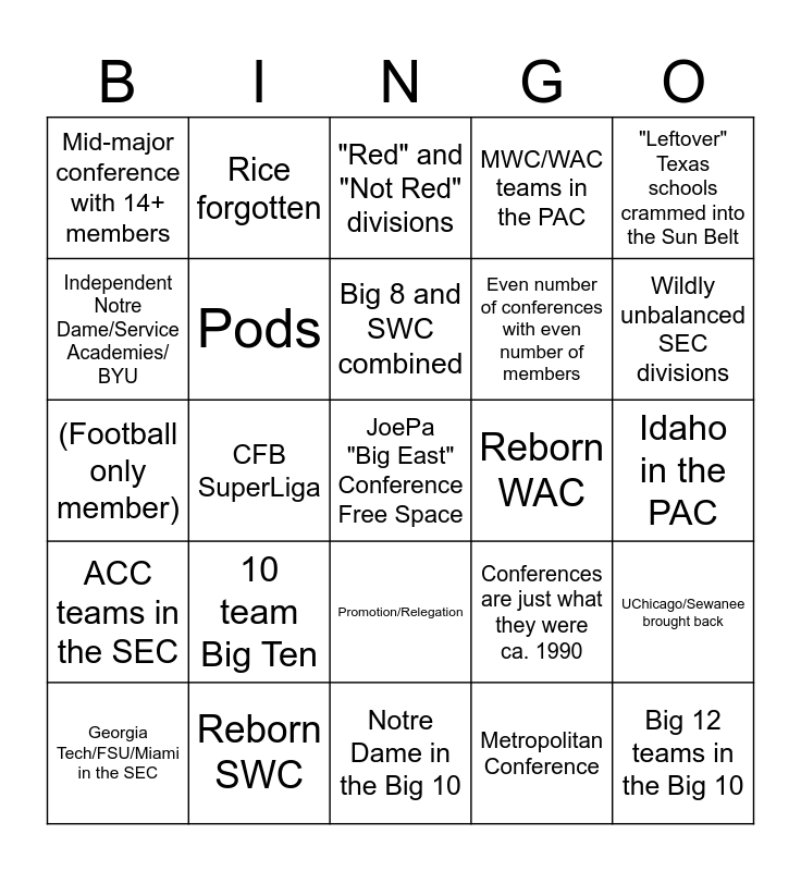 This bingo card has a free space and 24 words: 10 team Big Ten, Reborn SWC, Big 8 and SWC combined, Georgia Tech/FSU/Miami in the SEC, "Leftover" Texas schools crammed into the Sun Belt, Mid-major conference with 14+ members, Independent Notre Dame/Service Academies/ BYU, Rice forgotten, Reborn WAC, Promotion/Relegation, Even number of conferences with even number of members, (Football only member), Conferences are just what they were ca. 1990, UChicago/Sewanee brought back, Pods, Metropolitan Conference, Idaho in the PAC, "Red" and "Not Red" divisions, Wildly unbalanced SEC divisions, CFB SuperLiga, Big 12 teams in the Big 10, ACC teams in the SEC, MWC/WAC teams in the PAC and Notre Dame in the Big 10.