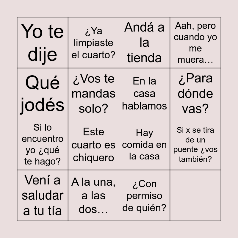 This bingo card has 16 words: Free!, Vení a saludar a tu tía, ¿Ya limpiaste el cuarto?, Andá a la tienda, ¿Para dónde vas?, Yo te dije, Este cuarto es chiquero, Hay comida en la casa, Aah, pero cuando yo me muera…, Qué jodés, A la una, a las dos…, En la casa hablamos, Si x se tira de un puente ¿vos también?, Si lo encuentro yo ¿qué te hago?, ¿Vos te mandas solo? and ¿Con permiso de quién?.