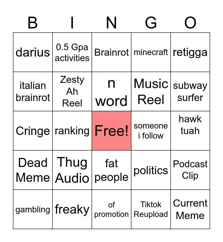 This bingo card has a free space and 24 words: Thug Audio, freaky, n word, gambling, retigga, darius, italian brainrot, 0.5 Gpa activities, someone i follow, fat people, Music Reel, Cringe, politics, Podcast Clip, Zesty Ah Reel, Tiktok Reupload, hawk tuah, Brainrot, subway surfer, ranking, Current Meme, Dead Meme, minecraft and of promotion.