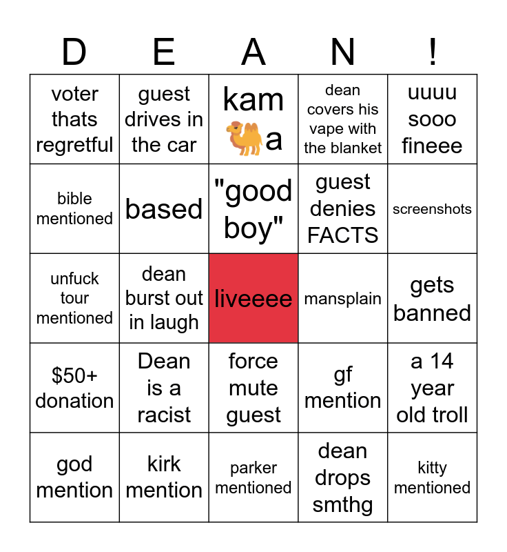 This bingo card has a free space and 24 words: god mention, Dean is a racist, "good boy", dean drops smthg, uuuu sooo fineee, voter thats regretful, guest drives in the car, kam🐫a, mansplain, gets banned, unfuck tour mentioned, based, gf mention, a 14 year old troll, bible mentioned, kirk mention, parker mentioned, dean covers his vape with the blanket, screenshots, $50+ donation, dean burst out in laugh, force mute guest, guest denies FACTS and kitty mentioned.