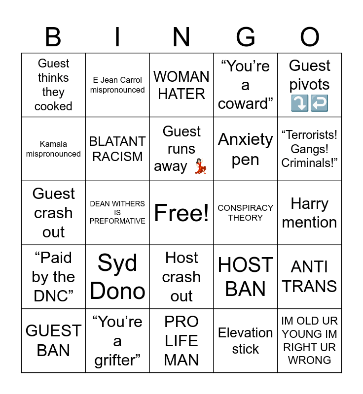 This bingo card has a free space and 24 words: Syd Dono, “You’re a grifter”, Guest runs away 💃🏻, GUEST BAN, Guest pivots ⤵️↩️, Guest thinks they cooked, Kamala mispronounced, E Jean Carrol mispronounced, CONSPIRACY THEORY, Host crash out, Anxiety pen, Guest crash out, HOST BAN, ANTI TRANS, BLATANT RACISM, Elevation stick, Harry mention, WOMAN HATER, “Terrorists! Gangs! Criminals!”, DEAN WITHERS IS PREFORMATIVE, IM OLD UR YOUNG IM RIGHT UR WRONG, “Paid by the DNC”, “You’re a coward” and PRO LIFE MAN.