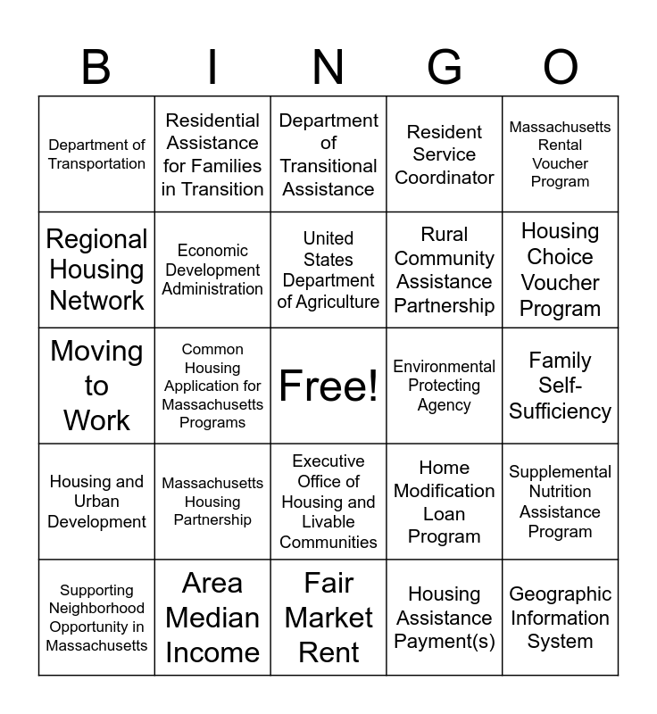 This bingo card has a free space and 30 words: Area Median Income, Community Economic Development Assistance Corporation, Common Housing Application for Massachusetts Programs, Citizens’ Housing and Planning Association, Department of Transportation, Department of Transitional Assistance, Economic Development Administration, Executive Office of Housing and Livable Communities, Environmental Protecting Agency, Fair Market Rent, Family Self-Sufficiency, Geographic Information System, Housing Assistance Payment(s), Housing Consumer Education Center, Housing Choice Voucher Program, Health and Human Services, Home Modification Loan Program, Housing and Urban Development, Massachusetts Housing Partnership, Massachusetts Rental Voucher Program, Moving to Work, Public Housing Authority, Residential Assistance for Families in Transition, Rural Community Assistance Partnership, Regional Housing Network, Resident Service Coordinator, Supplemental Nutrition Assistance Program, Supporting Neighborhood Opportunity in Massachusetts, United States Department of Agriculture and Veterans Affairs Supported Housing.