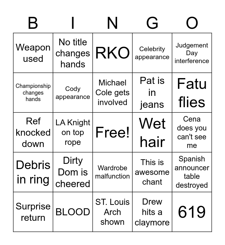 This bingo card has a free space and 24 words: Dirty Dom is cheered, BLOOD, Michael Cole gets involved, Surprise return, Judgement Day interference, Weapon used, Championship changes hands, No title changes hands, Wet hair, Wardrobe malfunction, Pat is in jeans, Ref knocked down, This is awesome chant, Spanish announcer table destroyed, Cody appearance, Drew hits a claymore, Cena does you can't see me, RKO, Fatu flies, LA Knight on top rope, 619, Debris in ring, Celebrity appearance and ST. Louis Arch shown.