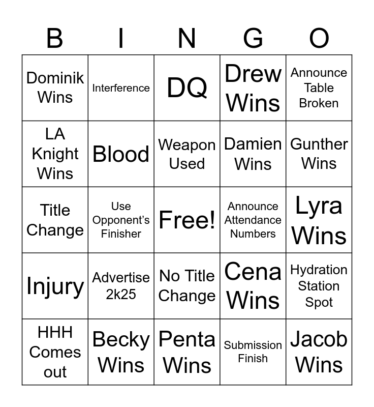 This bingo card has a free space and 32 words: Submission Finish, Super Finisher, Use Opponent’s Finisher, Tag Team Move, Injury, Blood, Announce Table Broken, Hydration Station Spot, Interference, Ref Knockout, Weapon Used, DQ, Betrayal, A Return, Announce Attendance Numbers, Crowd Chants This Is Awesome, HHH Comes out, Title Change, No Title Change, Advertise 2k25, Cena Wins, Orton Wins, Lyra Wins, Becky Wins, Jacob Wins, Drew Wins, Damien Wins, LA Knight Wins, Dominik Wins, Penta Wins, Pat Wins and Gunther Wins.
