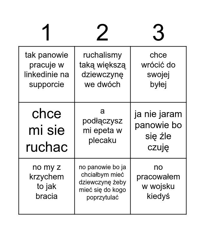 This bingo card has a free space and 8 words: ja nie jaram panowie bo się źle czuję, chce wrócić do swojej byłej, ruchalismy taką większą dziewczynę we dwóch, no my z krzychem to jak bracia, tak panowie pracuje w linkedinie na supporcie, no pracowałem w wojsku kiedyś, chce mi sie ruchac and no panowie bo ja chciałbym mieć dziewczynę żeby mieć się do kogo poprzytulać.