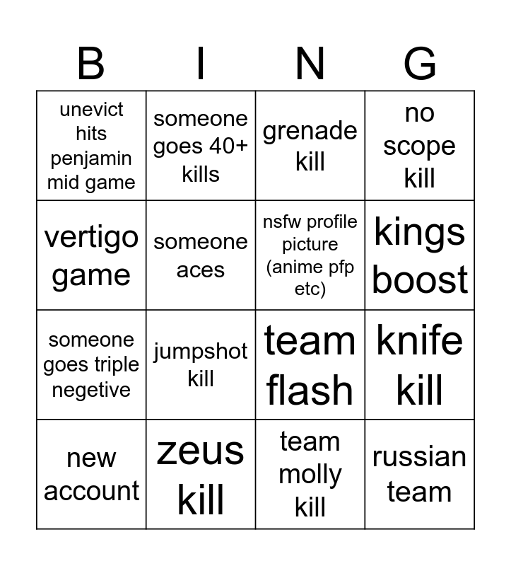 This bingo card has 16 words: zeus kill, knife kill, grenade kill, unevict hits penjamin mid game, someone goes triple negetive, someone goes 40+ kills, team flash, team molly kill, vertigo game, someone aces, new account, no scope kill, jumpshot kill, kings boost, nsfw profile picture (anime pfp etc) and russian team.