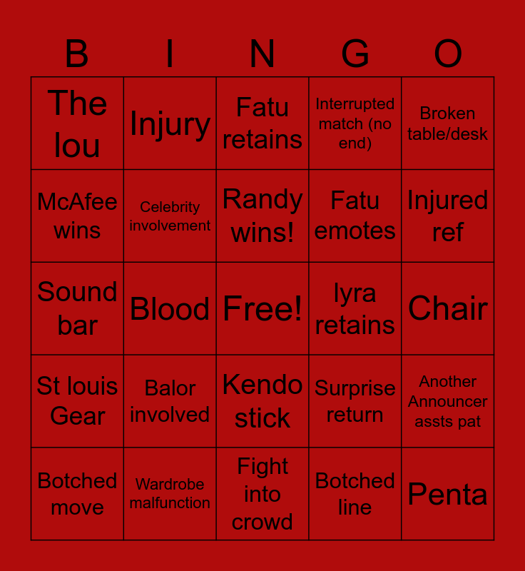 This bingo card has a free space and 24 words: Balor involved, Wardrobe malfunction, Randy wins!, Botched move, Broken table/desk, The lou, McAfee wins, Injury, lyra retains, Kendo stick, Fatu emotes, Sound bar, Surprise return, Another Announcer assts pat, Celebrity involvement, Botched line, Chair, Fatu retains, Injured ref, Blood, Penta, St louis Gear, Interrupted match (no end) and Fight into crowd.