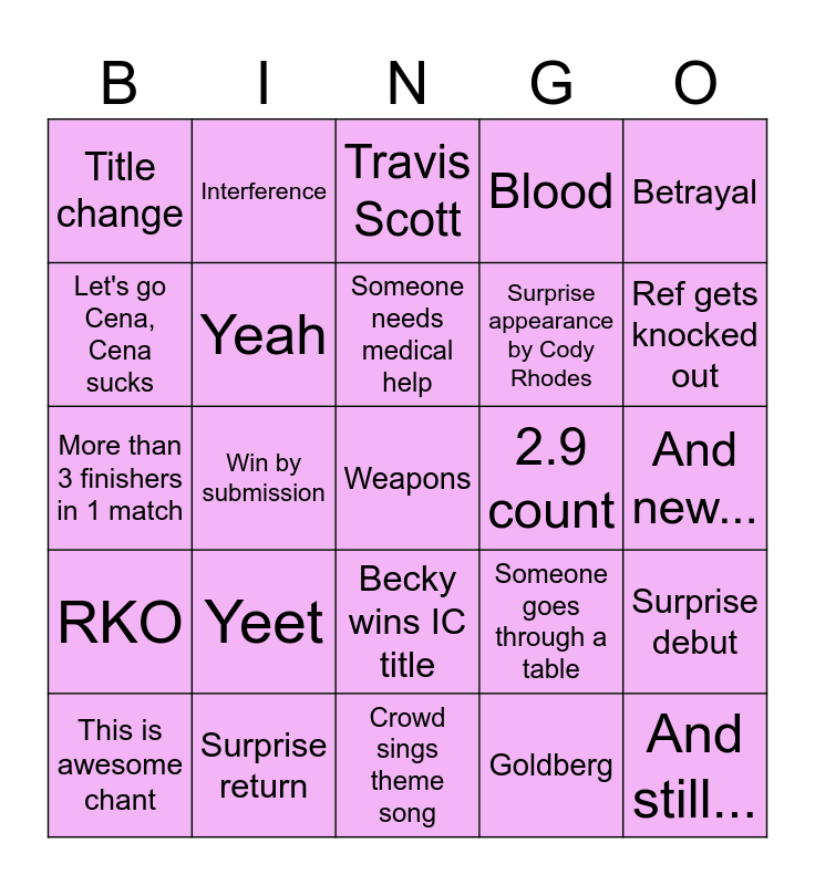 This bingo card has a free space and 24 words: Yeet, Surprise return, Someone needs medical help, This is awesome chant, Betrayal, Title change, Let's go Cena, Cena sucks, Interference, 2.9 count, Becky wins IC title, Surprise appearance by Cody Rhodes, More than 3 finishers in 1 match, Someone goes through a table, Surprise debut, Yeah, Goldberg, And new..., Travis Scott, Ref gets knocked out, Win by submission, And still..., RKO, Blood and Crowd sings theme song.