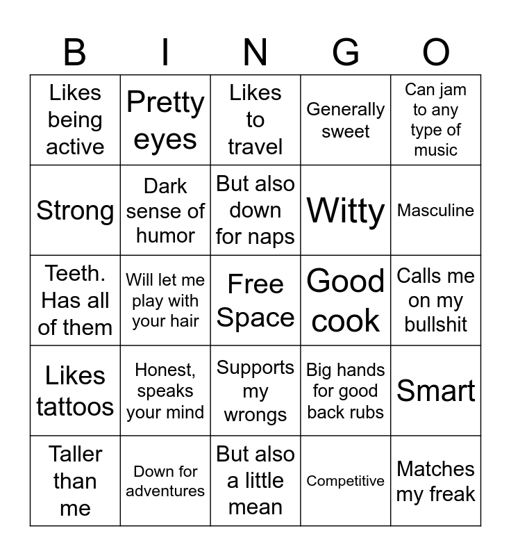 This bingo card has a free space and 24 words: Honest, speaks your mind, Down for adventures, But also down for naps, Taller than me, Can jam to any type of music, Likes being active, Strong, Pretty eyes, Good cook, Supports my wrongs, Witty, Teeth. Has all of them, Big hands for good back rubs, Smart, Dark sense of humor, Competitive, Calls me on my bullshit, Likes to travel, Masculine, Will let me play with your hair, Matches my freak, Likes tattoos, Generally sweet and But also a little mean.