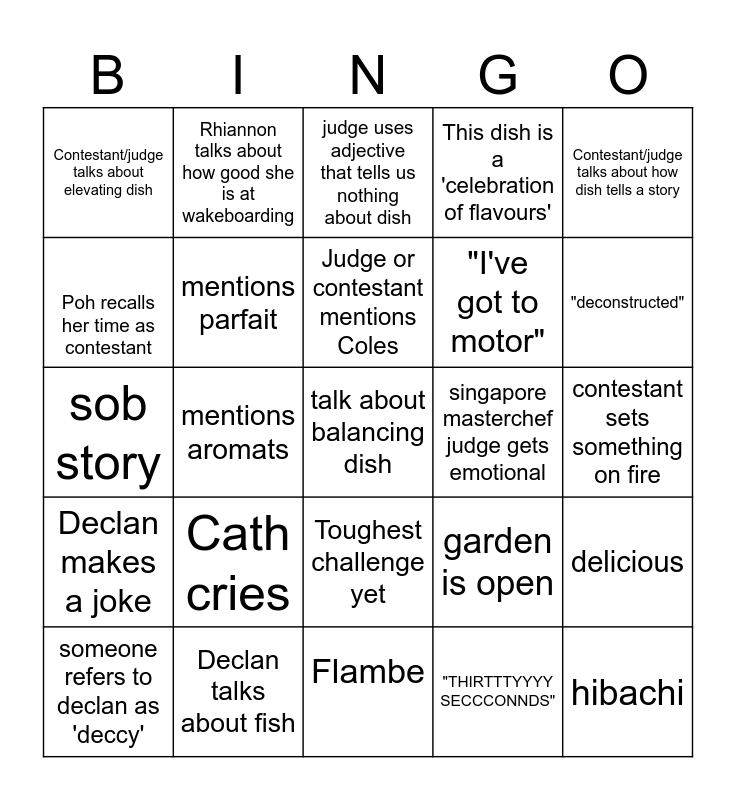 This bingo card has a free space and 24 words: Cath cries, Declan talks about fish, Judge or contestant mentions Coles, someone refers to declan as 'deccy', Contestant/judge talks about how dish tells a story, Contestant/judge talks about elevating dish, Poh recalls her time as contestant, Rhiannon talks about how good she is at wakeboarding, singapore masterchef judge gets emotional, Toughest challenge yet, "I've got to motor", sob story, garden is open, delicious, mentions parfait, "THIRTTTYYYY SECCCONNDS", contestant sets something on fire, judge uses adjective that tells us nothing about dish, "deconstructed", mentions aromats, hibachi, Declan makes a joke, This dish is a 'celebration of flavours' and Flambe.