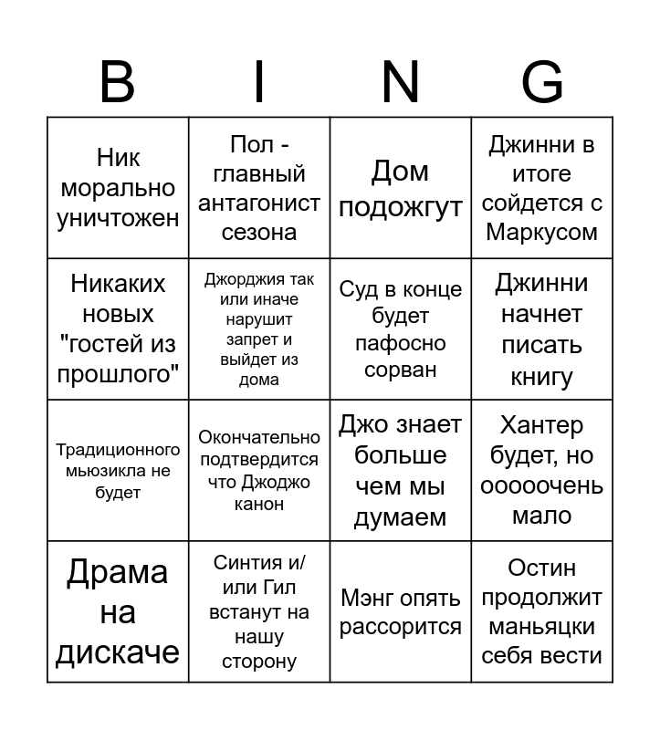 This bingo card has 16 words: Синтия и/или Гил встанут на нашу сторону, Хантер будет, но ооооочень мало, Дом подожгут, Ник морально уничтожен, Традиционного мьюзикла не будет, Пол - главный антагонист сезона, Джо знает больше чем мы думаем, Мэнг опять рассорится, Никаких новых "гостей из прошлого", Джорджия так или иначе нарушит запрет и выйдет из дома, Драма на дискаче, Джинни в итоге сойдется с Маркусом, Окончательно подтвердится что Джоджо канон, Джинни начнет писать книгу, Суд в конце будет пафосно сорван and Остин продолжит маньяцки себя вести.