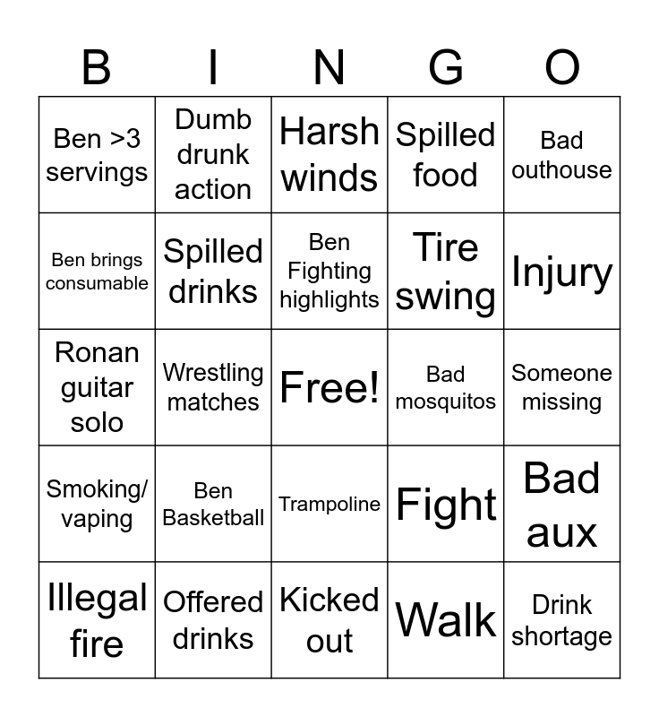 This bingo card has a free space and 24 words: Ben Basketball, Offered drinks, Ben Fighting highlights, Illegal fire, Bad outhouse, Ben >3 servings, Ben brings consumable, Dumb drunk action, Bad mosquitos, Trampoline, Tire swing, Ronan guitar solo, Fight, Bad aux, Spilled drinks, Walk, Someone missing, Harsh winds, Injury, Wrestling matches, Drink shortage, Smoking/ vaping, Spilled food and Kicked out.