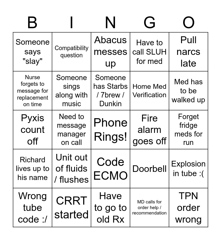 This bingo card has a free space and 24 words: Unit out of fluids / flushes, CRRT started, Someone has Starbs / 7brew / Dunkin, Wrong tube code :/, Pull narcs late, Someone says "slay", Nurse forgets to message for replacement on time, Compatibility question, Fire alarm goes off, Code ECMO, Home Med Verification, Pyxis count off, Doorbell, Explosion in tube :(, Someone sings along with music, MD calls for order help / recommendation, Forget fridge meds for run, Abacus messes up, Med has to be walked up, Need to message manager on call, TPN order wrong, Richard lives up to his name, Have to call SLUH for med and Have to go to old Rx.