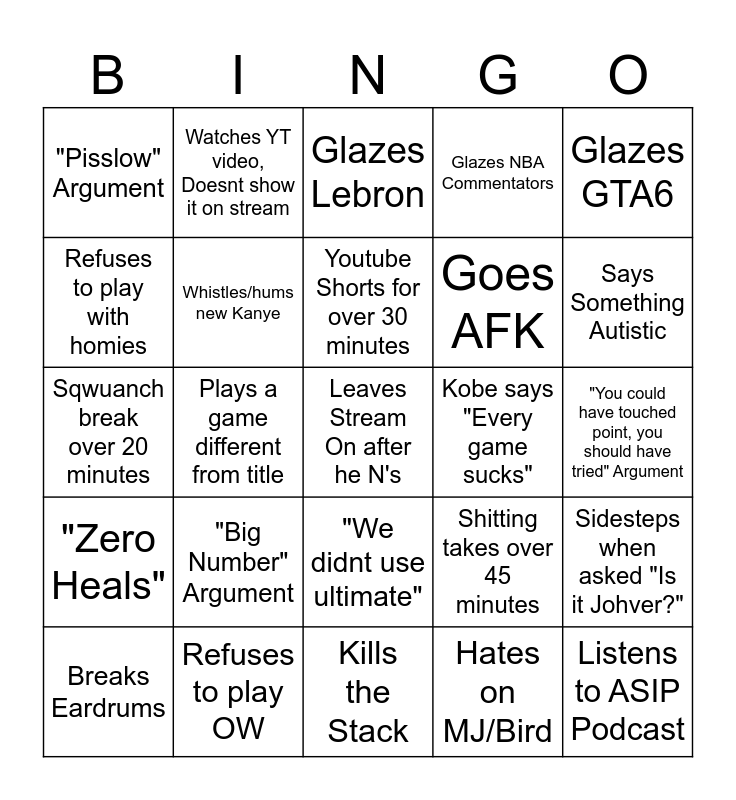 This bingo card has a free space and 24 words: "Big Number" Argument, Refuses to play OW, Youtube Shorts for over 30 minutes, Breaks Eardrums, Glazes GTA6, "Pisslow" Argument, Refuses to play with homies, Watches YT video, Doesnt show it on stream, Kobe says "Every game sucks", "We didnt use ultimate", Goes AFK, Sqwuanch break over 20 minutes, Shitting takes over 45 minutes, Sidesteps when asked "Is it Johver?", Whistles/hums new Kanye, Hates on MJ/Bird, "You could have touched point, you should have tried" Argument, Glazes Lebron, Says Something Autistic, Plays a game different from title, Listens to ASIP Podcast, "Zero Heals", Glazes NBA Commentators and Kills the Stack.