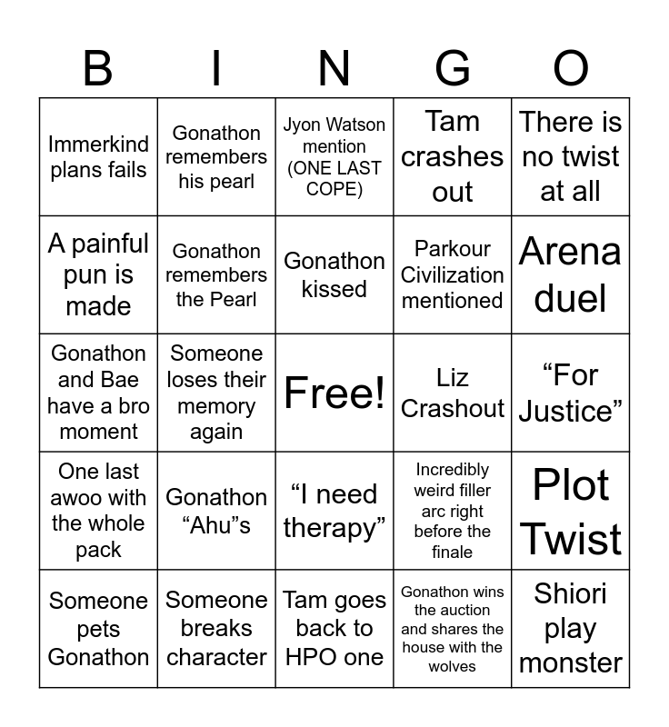 This bingo card has a free space and 24 words: Gonathon “Ahu”s, Someone breaks character, Gonathon kissed, Someone pets Gonathon, There is no twist at all, Immerkind plans fails, A painful pun is made, Gonathon remembers his pearl, Liz Crashout, “I need therapy”, Parkour Civilization mentioned, Gonathon and Bae have a bro moment, Incredibly weird filler arc right before the finale, Plot Twist, Gonathon remembers the Pearl, Gonathon wins the auction and shares the house with the wolves, “For Justice”, Jyon Watson mention (ONE LAST COPE), Arena duel, Someone loses their memory again, Shiori play monster, One last awoo with the whole pack, Tam crashes out and Tam goes back to HPO one.