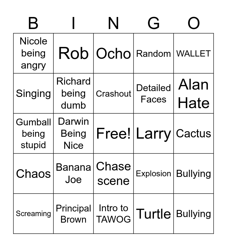 This bingo card has a free space and 24 words: Banana Joe, Principal Brown, Crashout, Screaming, WALLET, Nicole being angry, Singing, Rob, Larry, Chase scene, Detailed Faces, Gumball being stupid, Explosion, Bullying, Richard being dumb, Turtle, Cactus, Ocho, Alan Hate, Darwin Being Nice, Bullying, Chaos, Random and Intro to TAWOG.