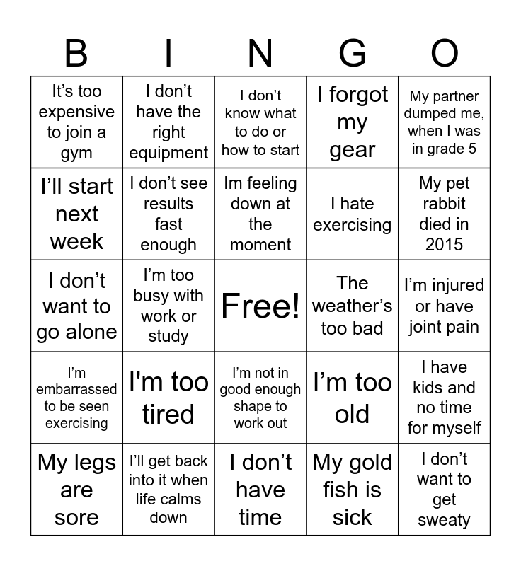 This bingo card has a free space and 25 words: I'm too tired, I don’t have time, Im feeling down at the moment, My legs are sore, My partner dumped me, when I was in grade 5, It’s too expensive to join a gym, I’ll start next week, I don’t have the right equipment, The weather’s too bad, I’m not in good enough shape to work out, I hate exercising, I don’t want to go alone, I’m too old, I have kids and no time for myself, I don’t see results fast enough, I get bored, I’m injured or have joint pain, I don’t know what to do or how to start, My pet rabbit died in 2015, I’m too busy with work or study, I don’t want to get sweaty, I’ll get back into it when life calms down, I’m embarrassed to be seen exercising, I forgot my gear and My gold fish is sick.