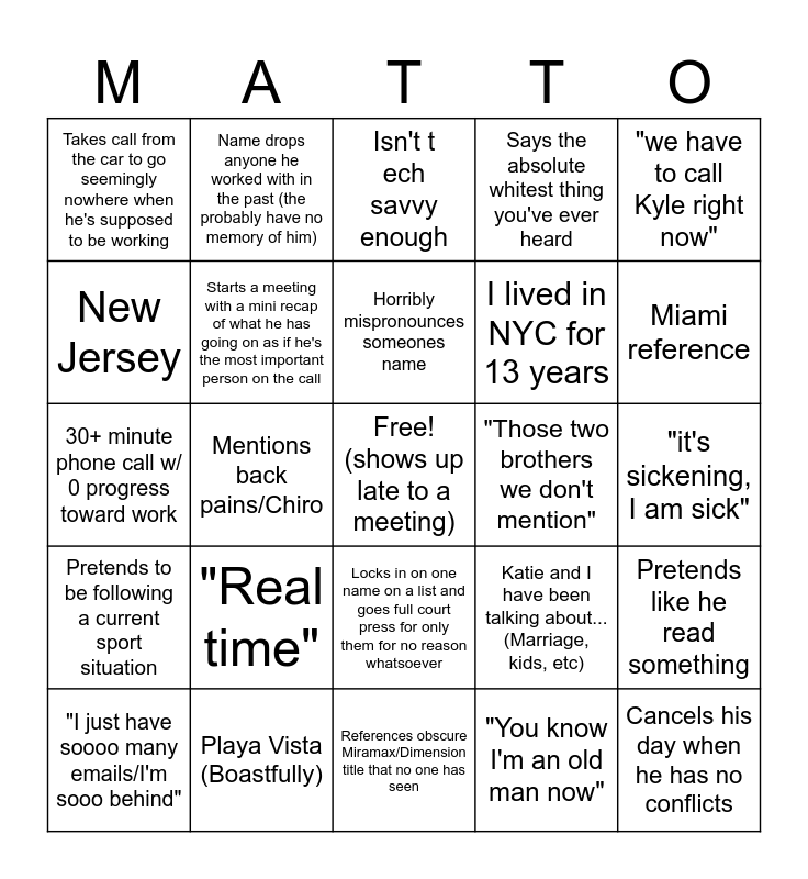 This bingo card has a free space and 24 words: "Real time", Playa Vista (Boastfully), Horribly mispronounces someones name, "I just have soooo many emails/I'm sooo behind", "we have to call Kyle right now", Takes call from the car to go seemingly nowhere when he's supposed to be working, New Jersey, Name drops anyone he worked with in the past (the probably have no memory of him), "Those two brothers we don't mention", Locks in on one name on a list and goes full court press for only them for no reason whatsoever, I lived in NYC for 13 years, 30+ minute phone call w/ 0 progress toward work, Katie and I have been talking about... (Marriage, kids, etc), Pretends like he read something, Starts a meeting with a mini recap of what he has going on as if he's the most important person on the call, "You know I'm an old man now", "it's sickening, I am sick", Isn't tech savvy enough, Miami reference, Mentions back pains/Chiro, Cancels his day when he has no conflicts, Pretends to be following a current sport situation, Says the absolute whitest thing you've ever heard and References obscure Miramax/Dimension title that no one has seen.