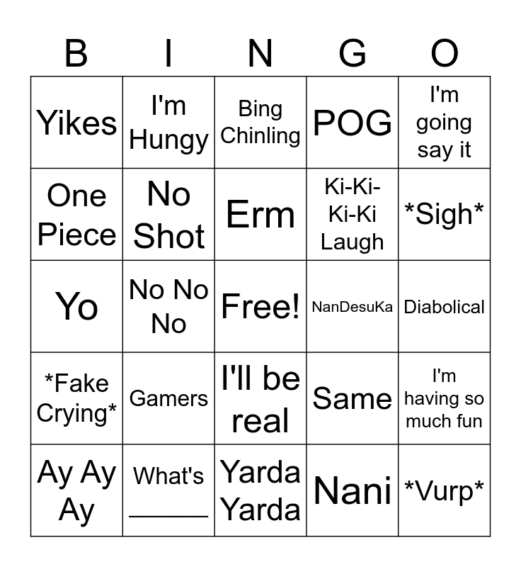 This bingo card has a free space and 25 words: Gamers, Yarda Yarda, Erm, Ay Ay Ay, I'm going say it, Yikes, One Piece, I'm Hungy, NanDesuKa, I'll be real, Ki-Ki-Ki-Ki Laugh, Yo, Same, I'm having so much fun, No Shot, Arigato Goziamasu, Diabolical, Bing Chinling, *Sigh*, No No No, *Vurp*, What's ______, *Fake Crying*, POG and Nani.