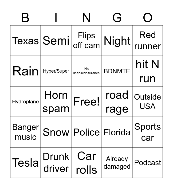 This bingo card has a free space and 24 words: Snow, Drunk driver, No license/insurance, Tesla, Red runner, Texas, Rain, Semi, road rage, Police, BDNMTE, Hydroplane, Florida, Sports car, Hyper/Super, Already damaged, Outside USA, Flips off cam, hit N run, Horn spam, Podcast, Banger music, Night and Car rolls.