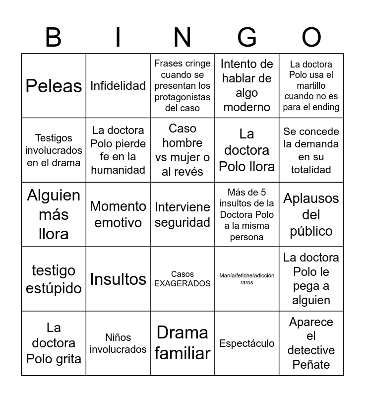 This bingo card has 25 words: Insultos, Drama familiar, Caso hombre vs mujer o al revés, La doctora Polo grita, La doctora Polo usa el martillo cuando no es para el ending, Peleas, Testigos involucrados en el drama, Infidelidad, Más de 5 insultos de la Doctora Polo a la misma persona, Casos EXAGERADOS, La doctora Polo llora, Alguien más llora, Manía/fetiche/adicción raros, La doctora Polo le pega a alguien, La doctora Polo pierde fe en la humanidad, Aparece el detective Peñate, Aplausos del público, Frases cringe cuando se presentan los protagonistas del caso, Se concede la demanda en su totalidad, Momento emotivo, Interviene seguridad, Niños involucrados, testigo estúpido, Intento de hablar de algo moderno and Espectáculo.