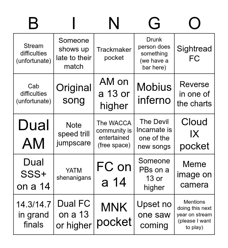 This bingo card has a free space and 24 words: YATM shenanigans, Dual FC on a 13 or higher, AM on a 13 or higher, 14.3/14.7 in grand finals, Sightread FC, Stream difficulties (unfortunate), Cab difficulties (unfortunate), Someone shows up late to their match, The Devil Incarnate is one of the new songs, FC on a 14, Mobius inferno, Dual AM, Someone PBs on a 13 or higher, Meme image on camera, Original song, Upset no one saw coming, Cloud IX pocket, Trackmaker pocket, Reverse in one of the charts, Note speed trill jumpscare, Mentions doing this next year on stream (please I want to play), Dual SSS+ on a 14, Drunk person does something (we have a bar here) and MNK pocket.