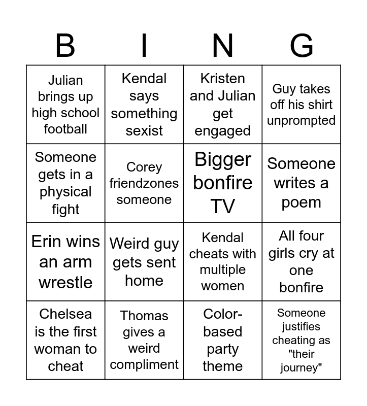This bingo card has 16 words: Thomas gives a weird compliment, All four girls cry at one bonfire, Kristen and Julian get engaged, Julian brings up high school football, Erin wins an arm wrestle, Kendal says something sexist, Kendal cheats with multiple women, Color-based party theme, Someone gets in a physical fight, Corey friendzones someone, Chelsea is the first woman to cheat, Guy takes off his shirt unprompted, Weird guy gets sent home, Someone writes a poem, Bigger bonfire TV and Someone justifies cheating as "their journey".