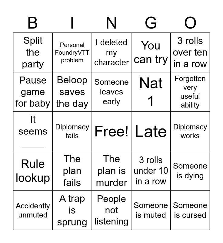 This bingo card has a free space and 28 words: Someone is dying, Nat 20, Nat 1, Someone is muted, Pause game for baby, I deleted my character, Personal FoundryVTT problem, Rule lookup, Late, Accidently unmuted, It seems ____, You can try, A trap is sprung, People not listening, Forgotten very useful ability, NPC exposition, The plan fails, Beloop saves the day, Someone leaves early, The plan is murder, Split the party, Timmy cards cause a problem, Someone is cursed, Diplomacy fails, Diplomacy works, 3 rolls under 10 in a row, 3 rolls over ten in a row and Backstory mentioned.