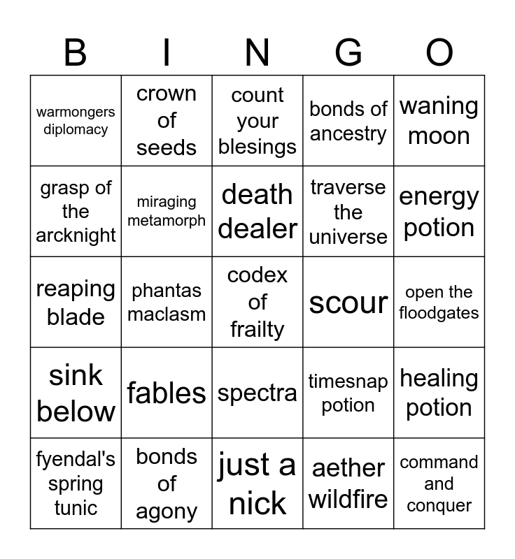 This bingo card has 25 words: fables, just a nick, death dealer, fyendal's spring tunic, waning moon, warmongers diplomacy, grasp of the arcknight, crown of seeds, scour, spectra, traverse the universe, reaping blade, timesnap potion, healing potion, miraging metamorph, command and conquer, open the floodgates, count your blesings, energy potion, phantas maclasm, codex of frailty, bonds of agony, sink below, bonds of ancestry and aether wildfire.