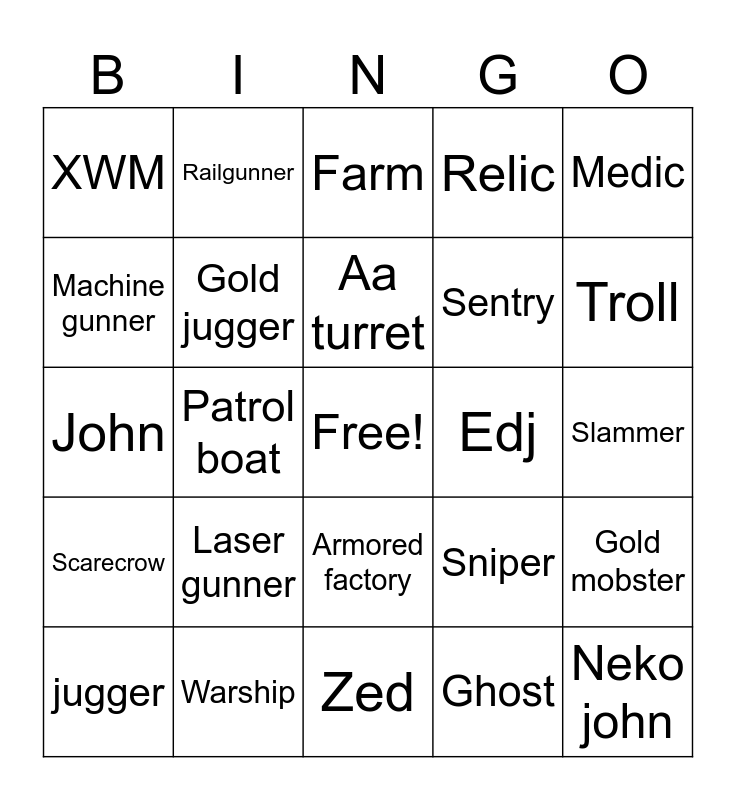 This bingo card has a free space and 24 words: Laser gunner, Warship, Aa turret, jugger, Medic, XWM, Machine gunner, Railgunner, Edj, Armored factory, Sentry, John, Sniper, Gold mobster, Gold jugger, Ghost, Slammer, Farm, Troll, Patrol boat, Neko john, Scarecrow, Relic and Zed.