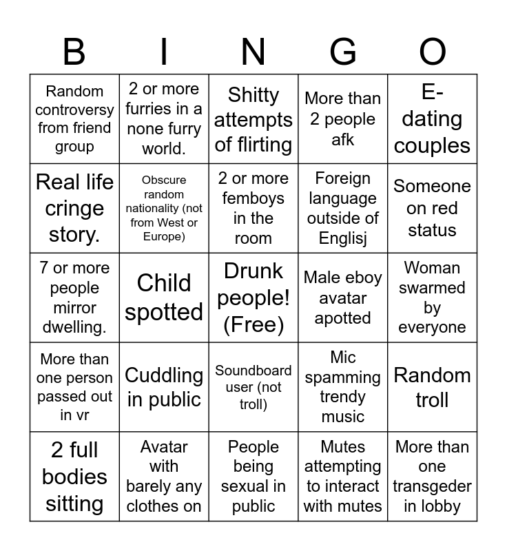 This bingo card has a free space and 24 words: 2 full bodies sitting, Cuddling in public, 2 or more femboys in the room, Mutes attempting to interact with mutes, E-dating couples, Random controversy from friend group, 2 or more furries in a none furry world., Shitty attempts of flirting, Male eboy avatar apotted, Woman swarmed by everyone, 7 or more people mirror dwelling., Obscure random nationality (not from West or Europe), Mic spamming trendy music, Random troll, Real life cringe story., Avatar with barely any clothes on, People being sexual in public, More than 2 people afk, Someone on red status, More than one person passed out in vr, Child spotted, Soundboard user (not troll), Foreign language outside of Englisj and More than one transgeder in lobby.
