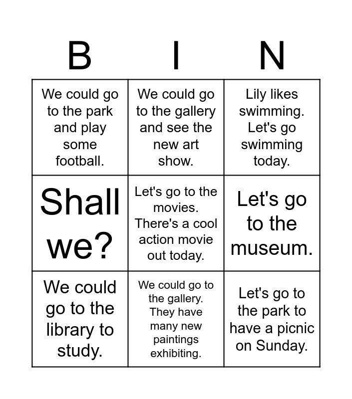 This bingo card has a free space and 8 words: Let's go to the museum., Lily likes swimming. Let's go swimming today., We could go to the gallery and see the new art show., We could go to the library to study., We could go to the park and play some football., Let's go to the park to have a picnic on Sunday., Shall we? and We could go to the gallery. They have many new paintings exhibiting..