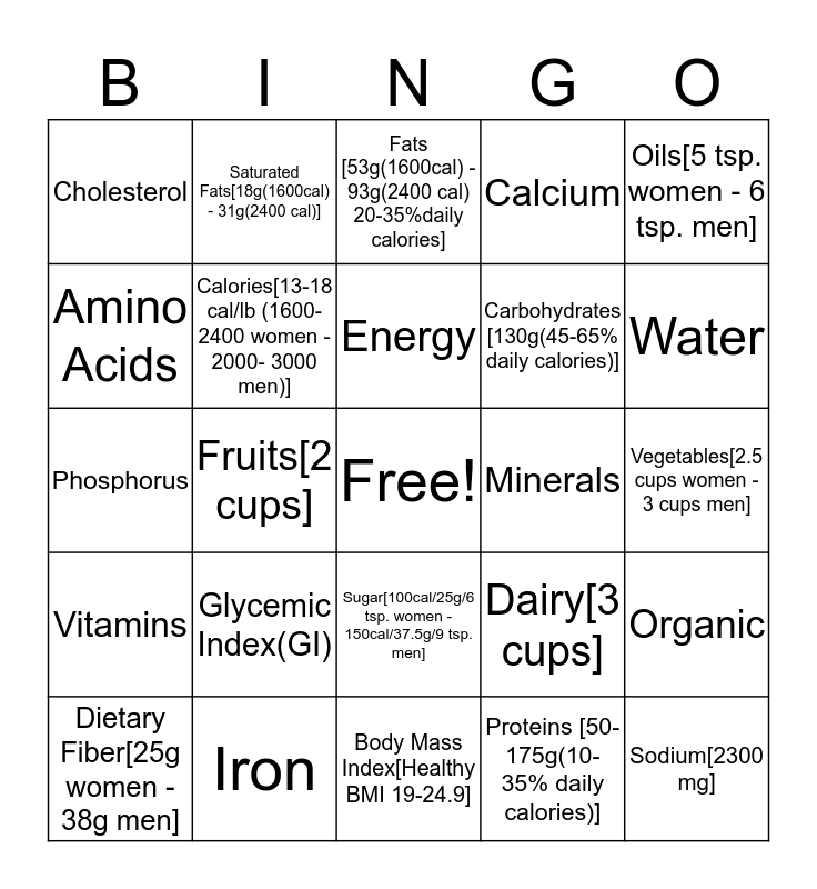 This bingo card has a free space and 28 words: Organic, Exercise, Carbohydrates [130g(45-65% daily calories)], Proteins [50-175g(10-35% daily calories)], Amino Acids, Fats [53g(1600cal) - 93g(2400 cal) 20-35%daily calories], Saturated Fats[18g(1600cal) - 31g(2400 cal)], Vitamins, Minerals, Dietary Fiber[25g women - 38g men], Phosphorus, Calcium, Iron, Body Mass Index[Healthy BMI 19-24.9], Water, Glucose, Glycemic Index(GI), Calories[13-18 cal/lb (1600-2400 women - 2000- 3000 men)], Energy, Sugar[100cal/25g/6 tsp. women - 150cal/37.5g/9 tsp. men], Cholesterol, Potassium[4300 mg], Sodium[2300 mg], Fruits[2 cups], Vegetables[2.5 cups women - 3 cups men], Dairy[3 cups], Oils[5 tsp. women - 6 tsp. men] and Whole grains.
