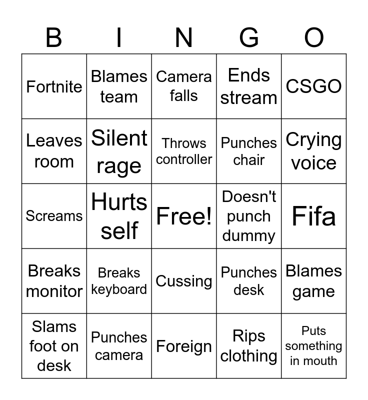 This bingo card has a free space and 24 words: Breaks keyboard, Punches camera, Throws controller, Slams foot on desk, CSGO, Fortnite, Leaves room, Blames team, Doesn't punch dummy, Cussing, Punches chair, Screams, Punches desk, Blames game, Silent rage, Rips clothing, Fifa, Camera falls, Crying voice, Hurts self, Puts something in mouth, Breaks monitor, Ends stream and Foreign.